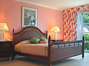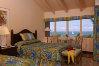 Frigate Room: An elegantly appointed room that can connect with the Frigate Suite, featuring two queen beds, spacious bath with double shower and tub, picture window and patio overlooking the pool, beach and sea. |